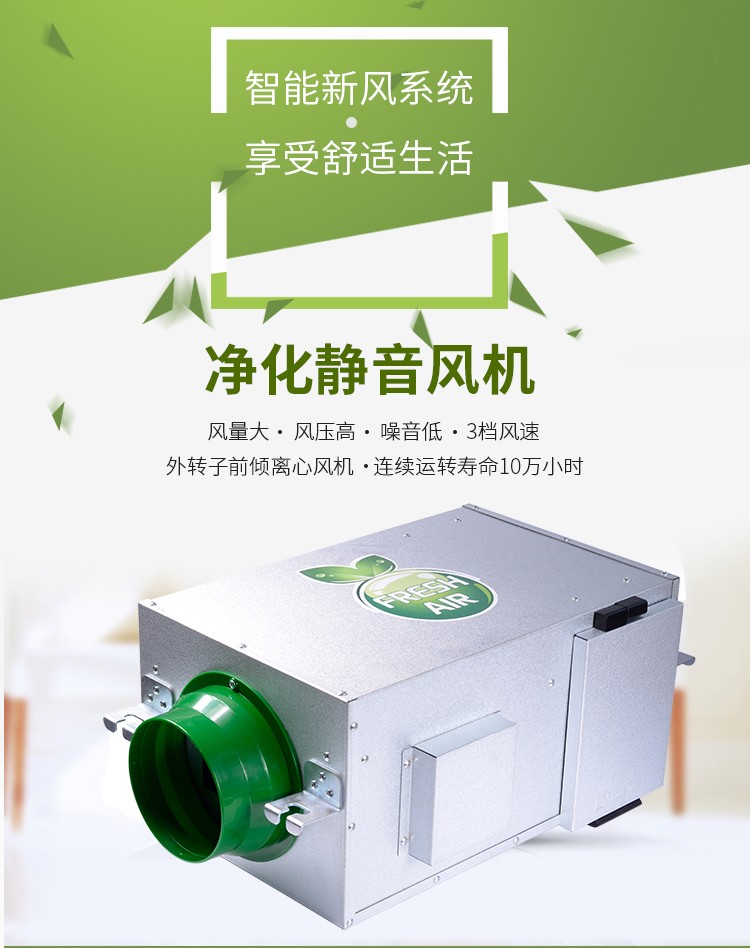 新风系统是根据在密闭的室内一侧用专用设备向室内送新风,再从另一侧由专用设备向室外排出,在室内会形成“新风流动场”,从而满足室内新风换气的需要。实施方案是:采用高风压、大流量风机、依靠机械强力由一侧向室内送风,由另一侧用专门设计的排风风机向室外排出的方式强迫在系统内形成新风流动场。在送风的同时对进入室内的空气进行过滤、消毒、杀菌、增氧、预热(冬天)。
